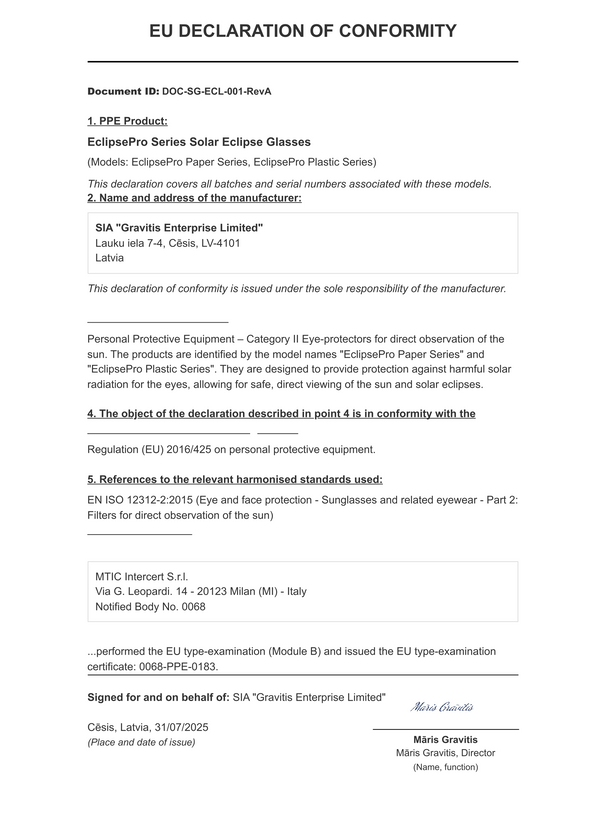 This certificate is issued by MTIC Intercert S.r.l. (Notified Body 0068) in accordance with Regulation (EU) 2016/425, Annex V (Module B). It confirms that the EclipsePro Paper and EclipsePro Plastic models comply with the Essential Health and Safety Requirements of Regulation (EU) 2016/425 and the harmonised standard EN ISO 12312-2:2015(E) for direct solar observation.