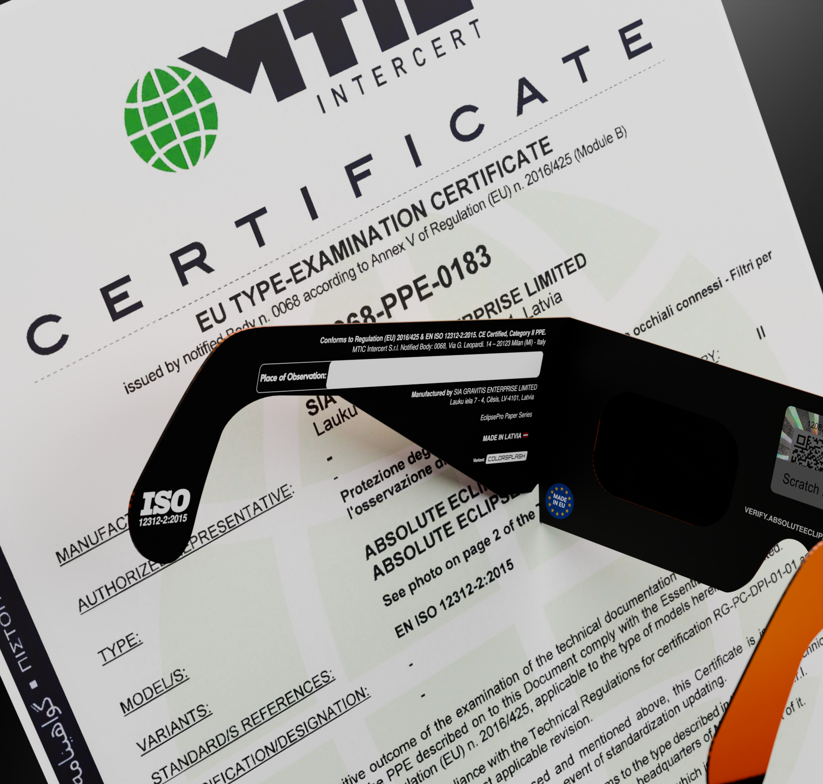 Our products have been independently tested and certified by MTIC Intercert (Notified Body 0068) in Italy, and they fully comply with EN ISO 12312-2:2015 and EU Regulation 2016/425 for Category II PPE. All certificates and laboratory test reports are publicly available for download, and our products have been reviewed and accepted by the American Astronomical Society (AAS) on their list of safe solar eclipse glasses suppliers.