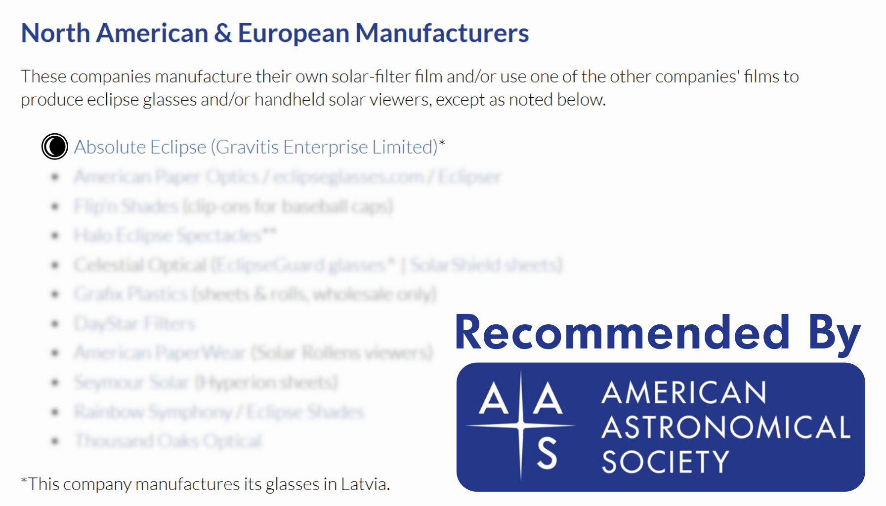 To protect the public, the AAS maintains a list of recommended eclipse glasses suppliers. Only companies that prove their products meet the ISO 12312-2 international safety standard are included.